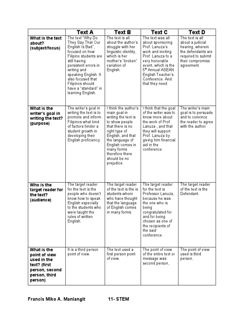 (subject/focus) for the text a is all about why do they say that our english is bad according to the text a that i've been read is that no matter how hard to speak in english, the teacher will do their best to try to teach the rules or the standard english, but base on my observation as a student it is not easy to learn and teach. Is the language used formal or informal? Persuasive writing focus lessons for teaching persuasive writing early adlescent lnk9tl001 | early adolescent | writing persuasive texts | focus lessons for teaching persuasive writing. University students often focus on one subject. What is the purpose of formatting a text?(1 point) a to help the reader follow and understand the writer's ideas b to make the print of the text visually appealing c to provide ways to include. Most authors agree that these. Exhibiting an inquisitive, critical attitude towards what you read will make anything you read. However, some people think that universities should encourage students to learn a range of other subjects. The text, why do they say that our english is bad, focused on how there were still persistent errors in writing and speaking of filipino students. Google has many special features to help you find exactly what you're looking for. Does the writer use scholarly evidences or references? Who is the target reader of the text? Learn focus with free interactive flashcards.