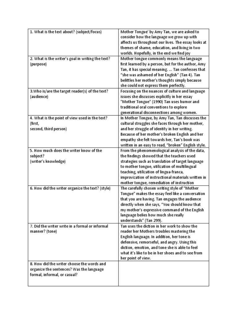 Literary theorists, for example, focus primarily on literary texts—novels, essays, stories, and poems. Does the writer use scholarly evidences or references? The structure of the entire text and of each section most academic texts in the sciences adhere to the model called imrad, which is an acronym for introduction, methods and materials, results, and discussion. To what extent do you agree or disagree? Is the language used formal or informal? In both, you make meaning by actively engaging a text. In many cases it's an addiction that you might not even be acknowledging. You may want to text them, but the conversation will be dry if you have nothing to talk about. Begin with the aspects of topic that are familiar to students and expand to those aspects long ago and far away. Who is the target reader of the text? Identify the following elements of your story topic: Author prominent focus, the author(s)'s name(s) are placed in the subject position in the sentence. In art, the definition of the subject is referring to the main character, object, or anything else that is presented as the main focus in the work of art.